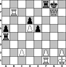 game notation in PGN-format [Event "5er5"] [Site "www.myChess.de"] [Date "2019.08.21"] [Round "1"] [White "beowulf"] [Black "skuehnel"] [ECO "A21"] [WhitemyELO "1351"] [BlackmyELO "1404"] [Result "1-0"] [TimeControl "10/3456000"] [WhiteDays "156"] [BlackDays "159"] [MyChessNo "115656"] 1. c4 e5 2. Nc3 d6 3. d3 Nf6 4. Bg5 b6 5. Nf3 Nc6 6. e3 Bb7 7. Be2 Be7 8. O-O O-O 9. d4 h6 10. Bxf6 Bxf6 11. d5 Ne7 12. e4 Ng6 13. Qd2 Nf4 14. b4 Qd7 15. a4 Qg4 16. Ne1 Ba6 17. Bxg4 Bxc4 18. Be2 Bg5 19. Qd1 Bxe2 20. Nxe2 Nxe2+ 21. Qxe2 f5 22. Nf3 f4 23. Nxg5 hxg5 24. Qh5 g4 25. Qxg4 f3 26. gxf3 Rf4 27. Qd7 Rxf3 28. Kg2 Rf7 29. Qc6 Raf8 30. Ra2 a5 31. bxa5 bxa5 32. Rb2 Rf4 33. Rb7 Rg4+ 34. Kh1 Rxe4 35. Qxc7 Rxa4 36. Qxg7# 1-0 position notation in FEN-format 5rk1/1R4Q1/3p4/p2Pp3/r7/8/2P2P1P/5R1K - - - 0 36 Captured white pieces: Captured black pieces: Click on a captured piece in order to display the desired move!