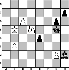 game notation in PGN-format [Event "Und wieder Aljechin...."] [Site "www.myChess.de"] [Date "2011.06.17"] [Round "1"] [White "Holzhacker"] [Black "woern63"] [ECO "B02"] [WhitemyELO "2080"] [BlackmyELO "1885"] [Result "1-0"] [TimeControl "10/2592000"] [WhiteDays "124"] [BlackDays "136"] [MyChessNo "74613"] 1. e4 Nf6 2. Nc3 d5 3. exd5 Nxd5 4. Bc4 e6 5. Nf3 Be7 6. O-O O-O 7. Re1 Nxc3 8. dxc3 Qxd1 9. Rxd1 Bd6 10. Ng5 Nd7 11. Ne4 Be7 12. a4 Ne5 13. Bb3 Ng6 14. a5 b6 15. f3 Bb7 16. Kf2 Bc6 17. Be3 Kh8 18. Nd2 Rfd8 19. Bc4 Rd7 20. axb6 cxb6 21. Nb3 Rc7 22. Bd3 Ne5 23. Be2 Bd5 24. Nd4 Bc4 25. Nb5 Rb7 26. Ra6 Bxe2 27. Kxe2 Nc4 28. b3 Nxe3 29. Kxe3 Bf6 30. Rda1 g6 31. Rxa7 Rbxa7 32. Rxa7 Rxa7 33. Nxa7 Bxc3 34. Kd3 Be1 35. Kc4 f5 36. Nc6 Kg7 37. Ne5 Bf2 38. Nd7 Kh6 39. Kb5 Kg5 40. c4 Bg1 41. Nxb6 e5 42. c5 Bxh2 43. c6 e4 44. fxe4 fxe4 45. Nd5 1-0 position notation in FEN-format 8/7p/2P3p1/1K1N2k1/4p3/1P6/6Pb/8 - - - 1 45 Captured white pieces: Captured black pieces: Click on a captured piece in order to display the desired move!