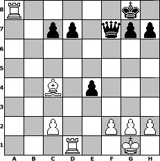 game notation in PGN-format [Event "CQS Sommer Open 2011"] [Site "www.myChess.de"] [Date "2011.08.01"] [Round "1"] [Board "5"] [White "Wulfen49"] [Black "Hobbykegler"] [ECO "C44"] [WhitemyELO "1309"] [BlackmyELO "1061"] [Result "1-0"] [TimeControl "10/3456000"] [WhiteDays "40"] [BlackDays "38"] [MyChessNo "75394"] 1. e4 e5 2. Nf3 Nc6 3. d4 Bd6 4. d5 Nb4 5. Bd2 a5 6. Be2 Nf6 7. O-O O-O 8. a3 Nxe4 9. axb4 b6 10. bxa5 bxa5 11. Bxa5 Rb8 12. Nbd2 Nxd2 13. Nxd2 Rxb2 14. Nc4 Rb5 15. Nxd6 Rc5 16. Nxc8 Qxc8 17. Bb4 Rxd5 18. Qxd5 Re8 19. Rfd1 e4 20. Bc4 Rf8 21. Bxf8 Qxf8 22. Qxf7+ Qxf7 23. Ra8# 1-0 position notation in FEN-format R5k1/2pp1qpp/8/8/2B1p3/8/2P2PPP/3R2K1 - - - 1 23 Captured white pieces: Captured black pieces: Click on a captured piece in order to display the desired move!