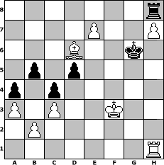 game notation in PGN-format [Event "unter uns Nr. 45 Adventturnier"] [Site "www.myChess.de"] [Date "2018.11.20"] [Round "1"] [White "Achimkogge"] [Black "Master1"] [ECO "A45"] [WhitemyELO "1377"] [BlackmyELO "1251"] [Result "1-0"] [TimeControl "10/864000"] [WhiteDays "52"] [BlackDays "27"] [MyChessNo "113497"] 1. d4 Nf6 2. c3 d5 3. h3 Bf5 4. Nd2 Nc6 5. Ngf3 e6 6. Qa4 Bd6 7. e3 O-O 8. Nh4 Ne7 9. Be2 c6 10. Nxf5 Nxf5 11. Bd3 b5 12. Qc2 Qd7 13. Nf3 a5 14. g4 Ne7 15. Ng5 Ng6 16. Bd2 a4 17. a3 h6 18. Nf3 Rfe8 19. Bxg6 fxg6 20. Qxg6 Ne4 21. Bc1 c5 22. Ke2 c4 23. h4 Qf7 24. Qxf7+ Kxf7 25. Ne5+ Kg8 26. Rf1 Bxe5 27. dxe5 Nc5 28. Rb1 Nb3 29. h5 Kh7 30. f4 g6 31. hxg6+ Kxg6 32. Kf3 Rf8 33. Rh1 Nc5 34. Bd2 Nb3 35. Be1 Nc5 36. Bh4 Ne4 37. Rbd1 Nc5 38. Be7 Rf7 39. Bxc5 Rc8 40. Bd6 Rh8 41. e4 h5 42. gxh5+ Kh6 43. Rdg1 Rg7 44. Rxg7 Kxg7 45. exd5 exd5 46. f5 Kh6 47. e6 Kg5 48. e7 Kxf5 49. h6 Kg6 50. h7 1-0 position notation in FEN-format 7r/4P2P/3B2k1/1p1p4/p1p5/P1P2K2/1P6/7R - - - 0 50 Captured white pieces: Captured black pieces: Click on a captured piece in order to display the desired move!