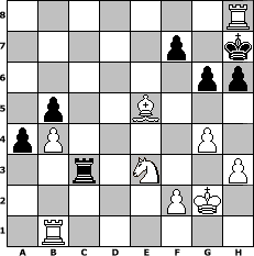 game notation in PGN-format [Event "Pott Schach - Glück Auf die xte."] [Site "www.myChess.de"] [Date "2020.11.05"] [Round "2"] [White "faustballer"] [Black "MiFie"] [ECO "C44"] [WhitemyELO "1547"] [BlackmyELO "1059"] [Result "1-0"] [TimeControl "10/2592000"] [WhiteDays "120"] [BlackDays "119"] [MyChessNo "119832"] 1. e4 e5 2. Nf3 Nc6 3. a3 Nf6 4. d3 Bc5 5. h3 O-O 6. b4 Bd6 7. Bb2 h6 8. Nbd2 a6 9. c4 b5 10. c5 a5 11. cxd6 cxd6 12. Bc3 a4 13. Be2 d5 14. exd5 Nxd5 15. Bb2 Nf4 16. Bf1 d6 17. Ne4 d5 18. Ng3 e4 19. dxe4 dxe4 20. Qxd8 Rxd8 21. Nxe4 Bf5 22. Ng3 Nd3+ 23. Bxd3 Rxd3 24. Nxf5 Re8+ 25. Kf1 Rd5 26. Ne3 Rd3 27. g4 Rb3 28. Rb1 Ne5 29. Nxe5 Rxe5 30. Kg2 g6 31. Bxe5 Rxa3 32. Rhd1 Rc3 33. Rd8+ Kh7 34. Rh8# 1-0 position notation in FEN-format 7R/5p1k/6pp/1p2B3/pP4P1/2r1N2P/5PK1/1R6 - - - 5 34 Captured white pieces: Captured black pieces: Click on a captured piece in order to display the desired move!