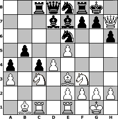 game notation in PGN-format [Event "YOUR LAST BREATH"] [Site "www.myChess.de"] [Date "2019.11.17"] [Round "2"] [White "Joschi"] [Black "Gauss1233"] [ECO "C62"] [WhitemyELO "1531"] [BlackmyELO "1428"] [Result "1-0"] [TimeControl "10/3456000"] [WhiteDays "40"] [BlackDays "38"] [MyChessNo "116388"] 1. e4 e5 2. Nf3 Nc6 3. Bb5 d6 4. O-O Bd7 5. Re1 Nf6 6. c3 Be7 7. d4 exd4 8. cxd4 O-O 9. Nc3 a6 10. Ba4 b5 11. Bc2 Nb4 12. Bb1 a5 13. a3 Na6 14. Bd3 c6 15. Bf4 Nh5 16. Be3 Nf6 17. Rb1 Nc7 18. b4 a4 19. Rc1 h6 20. Qd2 Ne6 21. Bb1 Rc8 22. Qd3 c5 23. bxc5 dxc5 24. e5 c4 25. Qc2 Ne8 26. Qh7# 1-0 position notation in FEN-format 2rqnrk1/3bbppQ/4n2p/1p2P3/p1pP4/P1N1BN2/4PPPP/1BR1R1K1 - - - 3 26 Captured white pieces: Captured black pieces: Click on a captured piece in order to display the desired move!