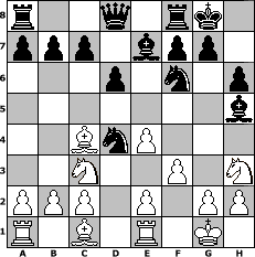 | game notation in PGN-format [Event "Mail"] [Site "www.myChess.de"] [Date "2012.05.01"] [Round "1"] [White "ndziemba"] [Black "Seneca"] [ECO "C41"] [WhitemyELO "1446"] [BlackmyELO "1353"] [Result "0-1"] [TimeControl "10/864000"] [WhiteDays "10"] [BlackDays "10"] [MyChessNo "81413"] 1. e4 e5 2. Nf3 d6 3. Bc4 Be7 4. Nc3 Nf6 5. Ng5 O-O 6. d4 Bg4 7. f3 Bh5 8. O-O exd4 9. Qxd4 h6 10. Nh3 Nc6 11. Re1 Nxd4 0-1 position notation in FEN-format r2q1rk1/ppp1bpp1/3p1n1p/7b/2BnP3/2N2P1N/PPP1P1PP/R1B1R1K1 - - - 0 12 Captured white pieces:                              Captured black pieces:                               Click on a captured piece in order to display the desired move!
