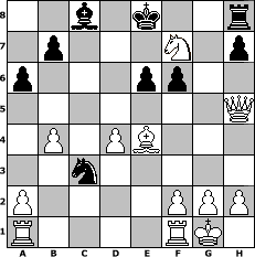 game notation in PGN-format [Event "MySchachOpen"] [Site "www.myChess.de"] [Date "2005.01.22"] [Round "1"] [White "bjeu"] [Black "Bernd"] [ECO "B01"] [WhitemyELO "1667"] [BlackmyELO "1382"] [Result "1-0"] [TimeControl "10/2592000"] [WhiteDays "90"] [BlackDays "77"] [MyChessNo "9891"] 1. e4 d5 2. exd5 Qxd5 3. Nc3 Qe5+ 4. Be2 e6 5. Nf3 Qf5 6. O-O Bb4 7. Nb5 a6 8. Nxc7+ Kd8 9. Nxa8 Ba5 10. c3 Nd7 11. b4 Bb6 12. Nxb6 Nxb6 13. d4 Nf6 14. Ne5 Ne4 15. Bd3 Nd5 16. Bxe4 Qf6 17. Bg5 Nxc3 18. Bxf6+ gxf6 19. Nxf7+ Ke8 20. Qh5 1-0 position notation in FEN-format 2b1k2r/1p3N1p/p3pp2/7Q/1P1PB3/2n5/P4PPP/R4RK1 - - - 2 20 Captured white pieces: Captured black pieces: Click on a captured piece in order to display the desired move!