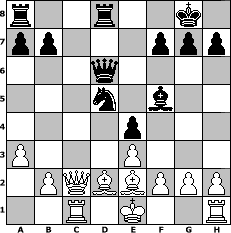 game notation in PGN-format [Event "9er3"] [Site "www.myChess.de"] [Date "2013.06.12"] [Round "1"] [White "FrankB"] [Black "spiderman"] [ECO "D05"] [WhitemyELO "1616"] [BlackmyELO "1616"] [Result "1/2-1/2"] [TimeControl "10/3456000"] [WhiteDays "35"] [BlackDays "39"] [MyChessNo "88687"] 1. d4 d5 2. Nf3 Nf6 3. e3 e6 4. a3 Bd6 5. c4 O-O 6. Nc3 c5 7. cxd5 Nxd5 8. Ne4 cxd4 9. Nxd6 Qxd6 10. Nxd4 Rd8 11. Be2 e5 12. Nf3 e4 13. Nd4 Qg6 14. Rg1 Nc6 15. Nxc6 Qxc6 16. Bd2 Qf6 17. Qc2 Bf5 18. Rc1 Qd6 19. Rh1 Qg6 20. Rg1 Qd6 21. Rh1 Qg6 22. Rg1 Qd6 23. Rh1 1/2-1/2 position notation in FEN-format r2r2k1/pp3ppp/3q4/3n1b2/4p3/P3P3/1PQBBPPP/2R1K2R - - - 15 23 Captured white pieces: Captured black pieces: Click on a captured piece in order to display the desired move!