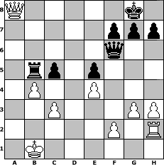 game notation in PGN-format [Event "Sommerpausen-F"] [Site "www.myChess.de"] [Date "2013.07.07"] [Round "1"] [White "lotchi"] [Black "gunni50"] [ECO "C41"] [WhitemyELO "1185"] [BlackmyELO "1260"] [Result "1-0"] [TimeControl "10/2592000"] [WhiteDays "092"] [BlackDays "103"] [MyChessNo "89176"] 1. e4 e5 2. Nf3 d6 3. Nc3 Nf6 4. d3 Nc6 5. Bg5 Be7 6. Bxf6 Bxf6 7. h3 O-O 8. Nd5 b5 9. Nxf6+ Qxf6 10. Be2 a6 11. a3 a5 12. c3 Be6 13. Qc2 d5 14. O-O-O dxe4 15. dxe4 a4 16. Bxb5 Ne7 17. Bxa4 Ng6 18. Bb3 Bxb3 19. Qxb3 Rab8 20. Qc4 Qf4+ 21. Kb1 Nh4 22. Nxh4 Qxh4 23. g3 Qf6 24. Rd2 Qf3 25. Rh2 Rfd8 26. Rxd8+ Rxd8 27. Ka2 Rc8 28. a4 c5 29. a5 Ra8 30. Qd5 Rxa5+ 31. Kb1 Qf6 32. b4 Rb5 33. Qa8+ 1-0 position notation in FEN-format Q5k1/5ppp/5q2/1rp1p3/1P2P3/2P3PP/5P1R/1K6 - - - 2 33 Captured white pieces: Captured black pieces: Click on a captured piece in order to display the desired move!
