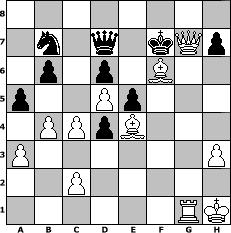 game notation in PGN-format [Event "PUNSCH-Turnier"] [Site "www.myChess.de"] [Date "2010.10.18"] [Round "1"] [White "haggard"] [Black "beowulf"] [ECO "A30"] [WhitemyELO "1814"] [BlackmyELO "1347"] [Result "1-0"] [TimeControl "10/2592000"] [WhiteDays "30"] [BlackDays "30"] [MyChessNo "69072"] 1. c4 c5 2. g3 g6 3. Bg2 Bg7 4. Nc3 Nc6 5. e4 e5 6. Nge2 Nge7 7. O-O O-O 8. d3 d6 9. h3 a6 10. a3 f5 11. Rb1 fxe4 12. dxe4 Be6 13. Nd5 Bxd5 14. exd5 Na5 15. b3 b6 16. Qd3 Qd7 17. Bd2 Nb7 18. f4 Nf5 19. Rbd1 Rae8 20. g4 Nd4 21. Nxd4 cxd4 22. b4 Rf7 23. f5 gxf5 24. gxf5 Ref8 25. Be4 Bf6 26. Kh1 Kh8 27. Rg1 Rg8 28. Rxg8+ Kxg8 29. Bh6 Kh8 30. Rg1 Bg7 31. Qg3 a5 32. f6 Rxf6 33. Bxg7+ Kg8 34. Bxf6+ Kf7 35. Qg7+ 1-0 position notation in FEN-format 8/1n1q1kQp/1p1p1B2/p2Pp3/1PPpB3/P6P/2P5/6RK - - - 2 35 Captured white pieces: ![]() ![]() ![]() ![]() ![]() ![]() ![]() ![]() ![]() ![]() ![]() ![]() ![]() ![]() ![]() Captured black pieces: ![]() ![]() ![]() ![]() ![]() ![]() ![]() ![]() ![]() ![]() ![]() ![]() ![]() ![]() ![]() Click on a captured piece in order to display the desired move!
