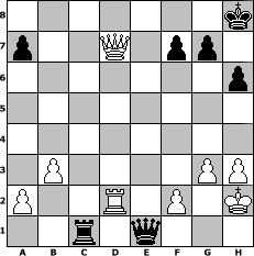 game notation in PGN-format [Event "Wrixum - Open die XI"] [Site "www.myChess.de"] [Date "2013.08.09"] [Round "1"] [White "martinus"] [Black "Papale"] [ECO "A52"] [WhitemyELO "1759"] [BlackmyELO "1672"] [Result "0-1"] [TimeControl "10/2592000"] [WhiteDays "30"] [BlackDays "28"] [MyChessNo "89622"] 1. d4 Nf6 2. c4 e5 3. dxe5 Ng4 4. Qd4 d6 5. Nf3 Nc6 6. Qe4 dxe5 7. Nc3 Bb4 8. Qc2 O-O 9. e4 Nd4 10. Qd1 c6 11. h3 Nf6 12. Bd2 Bxc3 13. Bxc3 Nxe4 14. Bxd4 exd4 15. Bd3 Re8 16. O-O c5 17. Re1 Nf6 18. Rxe8+ Qxe8 19. Qc2 b6 20. Re1 Qd8 21. Be4 Nxe4 22. Qxe4 Ba6 23. b3 h6 24. Nh4 b5 25. cxb5 Bxb5 26. Nf5 Qf8 27. Ne7+ Kh8 28. Qd5 d3 29. Qxc5 d2 30. Rd1 Re8 31. Qxb5 Qxe7 32. Rxd2 Rc8 33. Qd7 Rc1+ 34. Kh2 Qe5+ 35. g3 Qe1 0-1 position notation in FEN-format 7k/p2Q1pp1/7p/8/8/1P4PP/P2R1P1K/2r1q3 - - - 1 36 Captured white pieces: Captured black pieces: Click on a captured piece in order to display the desired move!