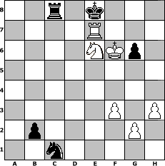 game notation in PGN-format [Event "Zwischendurch mal ein paar eigene Z"] [Site "www.myChess.de"] [Date "2009.06.25"] [Round "1"] [White "Master1"] [Black "reisender"] [ECO "A40"] [WhitemyELO "1273"] [BlackmyELO "1369"] [Result "1-0"] [TimeControl "10/1728000"] [WhiteDays "99"] [BlackDays "99"] [MyChessNo "56934"] 1. d4 g6 2. c4 Bg7 3. Nf3 Nf6 4. Bg5 d6 5. Nc3 Bf5 6. Bxf6 Bxf6 7. e4 Bg4 8. e5 dxe5 9. Be2 Nc6 10. dxe5 Qxd1+ 11. Rxd1 Bxe5 12. Nxe5 Nxe5 13. Bxg4 Nxg4 14. O-O O-O 15. Nd5 e6 16. Nxc7 Rac8 17. Nb5 Rxc4 18. Nxa7 Ra4 19. Nb5 Rxa2 20. Rb1 Ne5 21. Nc3 Raa8 22. Nb5 Nc4 23. Rfd1 Rfd8 24. Rxd8+ Rxd8 25. h3 Nd2 26. Ra1 Nc4 27. b3 Nb2 28. Ra7 Rd1+ 29. Kh2 Nd3 30. Kg3 Rb1 31. Nd6 Rxb3 32. f3 b5 33. Ne4 Ne5 34. Ng5 b4 35. Kf4 Nd3+ 36. Ke4 Rc3 37. Rxf7 b3 38. Rxh7 Nc1 39. Rb7 Rc2 40. Ke5 b2 41. Kf6 Rc8 42. Rg7+ Kf8 43. Nxe6+ Ke8 44. Re7# 1-0 position notation in FEN-format 2r1k3/4R3/4NKp1/8/8/5P1P/1p4P1/2n5 - - - 2 44 Captured white pieces: Captured black pieces: Click on a captured piece in order to display the desired move!