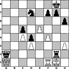 game notation in PGN-format [Event "3. Norderstedter DENK MAL Open 2012"] [Site "www.myChess.de"] [Date "2012.02.08"] [Round "1"] [White "Haki"] [Black "Knight"] [ECO "C50"] [WhitemyELO "1304"] [BlackmyELO "1260"] [Result "0-1"] [TimeControl "10/2592000"] [WhiteDays "30"] [BlackDays "30"] [MyChessNo "79821"] 1. e4 e5 2. Nf3 Nc6 3. Bc4 Bc5 4. d3 Nf6 5. Nc3 O-O 6. O-O Re8 7. Ng5 Rf8 8. Ne2 d6 9. Ng3 Bg4 10. Nf3 Nd4 11. Be3 Bxf3 12. gxf3 a6 13. a4 b5 14. axb5 axb5 15. Bxb5 Nxb5 16. Bxc5 dxc5 17. Rxa8 Qxa8 18. Nf5 Nd4 19. Nxd4 cxd4 20. Qd2 c5 21. c3 Rd8 22. c4 h6 23. f4 exf4 24. Qxf4 Re8 25. h3 Qa2 26. Qc1 Rb8 27. e5 Nd7 28. f4 Rxb2 29. Qa1 Rg2+ 0-1 position notation in FEN-format 6k1/3n1pp1/7p/2p1P3/2Pp1P2/3P3P/q5r1/Q4RK1 - - - 2 30 Captured white pieces: ![]() ![]() ![]() ![]() ![]() ![]() ![]() ![]() ![]() ![]() ![]() ![]() ![]() ![]() ![]() Captured black pieces: ![]() ![]() ![]() ![]() ![]() ![]() ![]() ![]() ![]() ![]() ![]() ![]() ![]() ![]() ![]() Click on a captured piece in order to display the desired move!