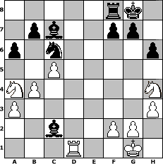 game notation in PGN-format [Event "Schachkreis #2"] [Site "www.myChess.de"] [Date "2018.07.05"] [Round "1"] [White "reisinger"] [Black "JohnWayne"] [ECO "A17"] [WhitemyELO "1485"] [BlackmyELO "1705"] [Result "0-1"] [TimeControl "10/2592000"] [WhiteDays "30"] [BlackDays "30"] [MyChessNo "112524"] 1. c4 Nf6 2. Nc3 e6 3. a3 d5 4. d4 c5 5. e3 Nc6 6. dxc5 Bxc5 7. b4 Bd6 8. c5 Bc7 9. h3 O-O 10. Nf3 e5 11. Be2 Bf5 12. O-O h6 13. Bb2 a6 14. Rc1 d4 15. exd4 exd4 16. Na4 d3 17. Bxf6 dxe2 18. Bxd8 exd1=Q 19. Rfxd1 Raxd8 20. Nh4 Rxd1+ 21. Rxd1 Bc2 0-1 position notation in FEN-format 5rk1/1pb2pp1/p1n4p/2P5/NP5N/P6P/2b2PP1/3R2K1 - - - 1 22 Captured white pieces: Captured black pieces: Click on a captured piece in order to display the desired move!