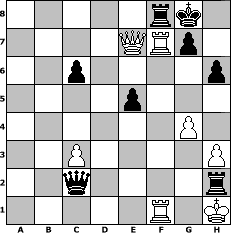 game notation in PGN-format [Event "August 18"] [Site "www.myChess.de"] [Date "2018.08.01"] [Round "1"] [White "Haneken"] [Black "Schefsche"] [ECO "C20"] [WhitemyELO "1060"] [BlackmyELO "1293"] [Result "0-1"] [TimeControl "10/1728000"] [WhiteDays "20"] [BlackDays "16"] [MyChessNo "112712"] 1. e4 e5 2. d3 d5 3. d4 dxe4 4. d5 Nf6 5. Bg5 h6 6. Bxf6 Qxf6 7. Nc3 Bb4 8. Qe2 Bxc3+ 9. bxc3 Bf5 10. Qb5+ Nd7 11. Qxb7 Qd8 12. Bb5 O-O 13. h3 Nc5 14. Qc6 a6 15. Qxc5 axb5 16. Qxb5 e3 17. fxe3 Bxc2 18. Nf3 Be4 19. O-O Bxf3 20. Rxf3 Qd6 21. Raf1 Rxa2 22. g3 c6 23. Qb1 Qxd5 24. e4 Qc4 25. g4 Re2 26. Qb4 Qxe4 27. Qe7 Qc2 28. Rxf7 Rg2+ 29. Kh1 Rh2+ 0-1 position notation in FEN-format 5rk1/4QRp1/2p4p/4p3/6P1/2P4P/2q4r/5R1K - - - 3 30 Captured white pieces: Captured black pieces: Click on a captured piece in order to display the desired move!