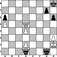 game notation in PGN-format [Event "In Memorium Michael Knopf"] [Site "www.myChess.de"] [Date "2012.04.10"] [Round "1"] [White "Achimkogge"] [Black "reisinger"] [ECO "A45"] [WhitemyELO "1421"] [BlackmyELO "1466"] [Result "0-1"] [TimeControl "10/2592000"] [WhiteDays "145"] [BlackDays "150"] [MyChessNo "81087"] 1. d4 Nf6 2. Nc3 d5 3. Bf4 e6 4. e3 Bb4 5. f3 O-O 6. Bd3 c5 7. a3 cxd4 8. exd4 Bxc3+ 9. bxc3 Nc6 10. Ne2 Re8 11. O-O e5 12. Bg3 e4 13. Bb5 exf3 14. gxf3 Qe7 15. Re1 Be6 16. Nf4 a6 17. Bxc6 bxc6 18. Nxe6 fxe6 19. Bh4 c5 20. Kf2 Rf8 21. Kg2 c4 22. Re5 Qf7 23. h3 Rab8 24. a4 Rb2 25. Rg5 h6 26. Re5 Qg6+ 27. Kh1 Rxc2 28. Re2 Rxc3 29. Rxe6 Rd3 30. Qg1 Qf5 31. Rxf6 Rxf6 32. Bxf6 Qxf6 33. Rf1 Rxf3 34. Rxf3 Qxf3+ 35. Kh2 c3 36. a5 Qe2+ 37. Kg3 c2 38. Qc1 Qd1 39. Qe3 c1=Q 40. Qe6+ Kh8 41. Qxd5 Qe3+ 42. Kh2 Qeg1# 0-1 position notation in FEN-format 7k/6p1/p6p/P2Q4/3P4/7P/3P3K/3q2q1 - - - 3 43 Captured white pieces: Captured black pieces: Click on a captured piece in order to display the desired move!
