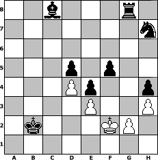 game notation in PGN-format [Event "Prätorianer"] [Site "www.myChess.de"] [Date "2023.01.04"] [Round "1"] [White "borsti"] [Black "lotchi"] [ECO "A02"] [WhitemyELO "1331"] [BlackmyELO "1229"] [Result "0-1"] [TimeControl "10/1728000"] [WhiteDays "20"] [BlackDays "20"] [MyChessNo "128923"] 1. f4 f5 2. d4 Nf6 3. Nc3 d5 4. e3 a6 5. Nf3 c6 6. Bd3 b5 7. a3 h6 8. Nh4 e6 9. Bxf5 exf5 10. Qf3 h5 11. Ng6 Rh6 12. Ne5 Bd6 13. h3 Bxe5 14. fxe5 Ne4 15. Nxe4 fxe4 16. Qf4 Ra7 17. Rf1 Nd7 18. e6 Nf6 19. Qe5 Re7 20. Bd2 Rxe6 21. Qg5 Qe7 22. O-O-O Nh7 23. Qf4 Kd7 24. Qf7 Rhf6 25. Qxe7+ Rxe7 26. Rxf6 gxf6 27. Rf1 Rg7 28. Rg1 Kd6 29. Bb4+ Kc7 30. Be1 f5 31. Bg3+ Rxg3 32. Kd2 a5 33. c3 Kb6 34. Ke2 c5 35. Kf2 h4 36. Re1 c4 37. Re2 b4 38. cxb4 axb4 39. a4 Ka5 40. b3 cxb3 41. Rb2 Kxa4 42. Rb1 Ka3 43. Ra1+ Kb2 44. Ra8 Rg8 45. Rb8 Kc2 46. Rxb4 b2 47. Rxb2+ Kxb2 0-1 position notation in FEN-format 2b3r1/7n/8/3p1p2/3Pp2p/4P2P/1k3KP1/8 - - - 0 48 Captured white pieces: Captured black pieces: Click on a captured piece in order to display the desired move!