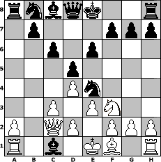 game notation in PGN-format [Event "Loyal to the Game"] [Site "www.myChess.de"] [Date "2005.12.23"] [Round "1"] [White "Andi56"] [Black "Biber"] [ECO "D01"] [WhitemyELO "931"] [BlackmyELO "1267"] [Result "0-1"] [TimeControl "10/864000"] [WhiteDays "03"] [BlackDays "09"] [MyChessNo "20987"] 1. d4 d5 2. Nc3 Nc6 3. Nf3 e6 4. b4 a6 5. b5 axb5 6. Nxb5 Nf6 7. e3 Be7 8. c3 Ne4 9. Qd3 Nb8 10. Qd1 c6 11. Na3 Bxa3 12. Qc2 Bxc1 0-1 position notation in FEN-format rnbqk2r/1p3ppp/2p1p3/3p4/3Pn3/2P1PN2/P1QP1PPP/R1b1KB1R - KQkq - 0 13 Captured white pieces: Captured black pieces: Click on a captured piece in order to display the desired move!