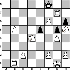 game notation in PGN-format [Event "Turnier zum Tag der deutschen Einheit 2015"] [Site "www.myChess.de"] [Date "2015.10.03"] [Round "1"] [White "paul"] [Black "borsti"] [ECO "C41"] [WhitemyELO "1348"] [BlackmyELO "1302"] [Result "1-0"] [TimeControl "10/1728000"] [WhiteDays "34"] [BlackDays "80"] [MyChessNo "100621"] 1. e4 e5 2. Nf3 d6 3. Nc3 Nf6 4. d4 Bg4 5. Bg5 h6 6. Bxf6 Qxf6 7. Be2 Bh5 8. O-O Nc6 9. d5 Nd4 10. Qd3 a6 11. b4 g5 12. Nxd4 Bxe2 13. Ncxe2 Bg7 14. Nf5 O-O 15. Neg3 b5 16. a4 Qd8 17. axb5 axb5 18. Qxb5 Rb8 19. Qc4 Qd7 20. Nh5 f6 21. Ra7 Rfc8 22. Nfxg7 Qf7 23. Rb1 Qd7 24. Nf5 Qb5 25. Qxb5 Rxb5 26. Ne7+ Kf7 27. Nxc8 Kg6 28. g4 f5 29. exf5+ Kh7 30. Rxc7+ Kg8 31. f6 Rb8 32. Rg7+ Kf8 33. Nxd6 Rd8 34. Nf5 Rxd5 35. b5 Rd4 36. Nxd4 1-0 position notation in FEN-format 5k2/6R1/5P1p/1P2p1pN/3N2P1/8/2P2P1P/1R4K1 - - - 0 36 Captured white pieces: Captured black pieces: Click on a captured piece in order to display the desired move!