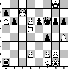 game notation in PGN-format [Event "Ja, is denn heut scho Weihnachten?"] [Site "www.myChess.de"] [Date "2014.12.06"] [Round "1"] [White "pepo47"] [Black "Wernburger"] [ECO "E39"] [WhitemyELO "2083"] [BlackmyELO "1835"] [Result "1-0"] [TimeControl "10/2592000"] [WhiteDays "113"] [BlackDays "071"] [MyChessNo "97038"] 1. d4 Nf6 2. c4 e6 3. Nc3 Bb4 4. Qc2 c5 5. dxc5 O-O 6. a3 Bxc5 7. Nf3 Nc6 8. Bg5 h6 9. Bh4 Be7 10. Rd1 b6 11. e4 Bb7 12. Be2 Rc8 13. O-O Na5 14. Bxf6 Bxf6 15. Nb5 Ba6 16. Nd6 Rc6 17. e5 Be7 18. b4 Nxc4 19. b5 Ne3 20. Qe4 Nxd1 21. Bd3 g6 22. Rxd1 Rc3 23. bxa6 Rxa3 24. h4 Bxd6 25. exd6 Ra5 26. Ne5 f5 27. Qe2 Kh7 28. Bb5 f4 29. Nxd7 Rf5 30. Qc4 Rd5 31. Nf6+ Qxf6 32. Qc7+ Kg8 33. Rxd5 Ra1+ 34. Bf1 1-0 position notation in FEN-format 6k1/p1Q5/Pp1Ppqpp/3R4/5p1P/8/3P1PP1/r4BK1 - - - 2 34 Captured white pieces: ![]() ![]() ![]() ![]() ![]() ![]() ![]() ![]() ![]() ![]() ![]() ![]() ![]() ![]() ![]() Captured black pieces: ![]() ![]() ![]() ![]() ![]() ![]() ![]() ![]() ![]() ![]() ![]() ![]() ![]() ![]() ![]() Click on a captured piece in order to display the desired move!