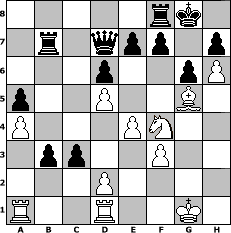 game notation in PGN-format [Event "Hitzeschlacht"] [Site "www.myChess.de"] [Date "2009.08.13"] [Round "1"] [White "Knight"] [Black "Papale"] [ECO "A40"] [WhitemyELO "1179"] [BlackmyELO "1733"] [Result "0-1"] [TimeControl "10/864000"] [WhiteDays "10"] [BlackDays "10"] [MyChessNo "58287"] 1. d4 g6 2. e4 Bg7 3. Nc3 d6 4. Nf3 Nf6 5. Bg5 O-O 6. Bd3 c5 7. d5 Bg4 8. O-O Nbd7 9. Re1 Ne5 10. Be2 Nxf3+ 11. Bxf3 Bxf3 12. Qxf3 Nd7 13. h4 Rb8 14. h5 b5 15. h6 Bh8 16. Ne2 Bxb2 17. Rab1 Bh8 18. Nf4 Ne5 19. Qe3 Rb7 20. a4 b4 21. c3 a5 22. Qh3 Qd7 23. Qh2 Ng4 24. Qg3 Bxc3 25. Red1 Bh8 26. Qb3 Ne5 27. f3 c4 28. Qa2 b3 29. Qa1 Nxf3+ 30. gxf3 Bxa1 31. Rxa1 c3 0-1 position notation in FEN-format 5rk1/1r1qpp1p/3p2pP/p2P2B1/P3PN2/1pp2P2/3P4/R2R2K1 - - - 0 32 Captured white pieces: Captured black pieces: Click on a captured piece in order to display the desired move!