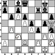 game notation in PGN-format [Event "Winter 2018"] [Site "www.myChess.de"] [Date "2018.01.10"] [Round "1"] [White "larlinde"] [Black "atlantis"] [ECO "E73"] [WhitemyELO "2146"] [BlackmyELO "1897"] [Result "1-0"] [TimeControl "10/2592000"] [WhiteDays "44"] [BlackDays "00"] [MyChessNo "111012"] 1. d4 Nf6 2. c4 g6 3. Nc3 Bg7 4. e4 d6 5. Be2 O-O 6. Nf3 e5 7. O-O Nc6 8. d5 Ne7 9. Re1 Ne8 10. Bg5 h6 11. Bd2 f5 12. Rc1 f4 13. h3 g5 14. b4 Nf6 15. c5 Rf7 16. c6 b6 17. Nh2 Ng6 18. Bh5 Nxh5 19. Qxh5 Nh4 20. g3 1-0 position notation in FEN-format r1bq2k1/p1p2rb1/1pPp3p/3Pp1pQ/1P2Pp1n/2N3PP/P2B1P1N/2R1R1K1 - - - 0 20 Captured white pieces: Captured black pieces: Click on a captured piece in order to display the desired move!