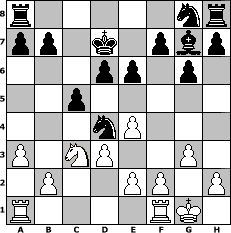 game notation in PGN-format [Event "Schachturnier Vier"] [Site "www.myChess.de"] [Date "2016.04.26"] [Round "1"] [White "Winston"] [Black "kalle"] [ECO "B50"] [WhitemyELO "1432"] [BlackmyELO "1692"] [Result "1-0"] [TimeControl "10/1728000"] [WhiteDays "16"] [BlackDays "00"] [MyChessNo "103433"] 1. e4 c5 2. Nf3 d6 3. Nc3 Nc6 4. a3 g6 5. Ng5 Bg7 6. Bc4 e6 7. Qf3 Qxg5 8. d4 Qf6 9. Bf4 Nxd4 10. Bb5+ Bd7 11. Qd3 Qxf4 12. Bxd7+ Kxd7 13. g3 Qf3 14. O-O Qxd3 15. cxd3 1-0 position notation in FEN-format r5nr/pp1k1pbp/3pp1p1/2p5/3nP3/P1NP2P1/1P2PP1P/R4RK1 - - - 0 15 Captured white pieces: Captured black pieces: Click on a captured piece in order to display the desired move!