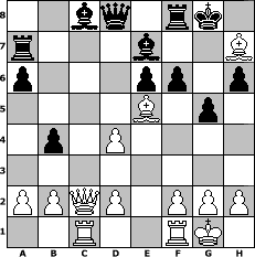 game notation in PGN-format [Event "QGD: Orthodox Verteidigung"] [Site "www.myChess.de"] [Date "2008.08.11"] [Round "1"] [White "andreas007"] [Black "Knight"] [ECO "D64"] [WhitemyELO "1391"] [BlackmyELO "1234"] [Result "1-0"] [TimeControl "10/2592000"] [WhiteDays "90"] [BlackDays "90"] [MyChessNo "47025"] 1. d4 d5 2. c4 e6 3. Nc3 Nf6 4. Bg5 Be7 5. e3 O-O 6. Nf3 Nbd7 7. Rc1 c6 8. Qc2 a6 9. Bd3 h6 10. Bh4 g5 11. Bg3 c5 12. O-O cxd4 13. exd4 dxc4 14. Bxc4 b5 15. Bd3 b4 16. Ne4 Nxe4 17. Bxe4 Ra7 18. Ne5 Nxe5 19. Bxe5 f6 20. Bh7+ 1-0 position notation in FEN-format 2bq1rk1/r3b2B/p3pp1p/4B1p1/1p1P4/8/PPQP1PPP/2R2RK1 - - - 1 20 Captured white pieces: ![]() ![]() ![]() ![]() ![]() ![]() ![]() ![]() ![]() ![]() ![]() ![]() ![]() ![]() ![]() Captured black pieces: ![]() ![]() ![]() ![]() ![]() ![]() ![]() ![]() ![]() ![]() ![]() ![]() ![]() ![]() ![]() Click on a captured piece in order to display the desired move!