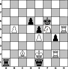 game notation in PGN-format [Event "André Chéron - 30. Todestag"] [Site "www.myChess.de"] [Date "2010.09.12"] [Round "1"] [White "sprinterde"] [Black "martinus"] [ECO "A16"] [WhitemyELO "1506"] [BlackmyELO "1771"] [Result "0-1"] [TimeControl "10/1728000"] [WhiteDays "118"] [BlackDays "114"] [MyChessNo "68279"] 1. c4 Nf6 2. Nc3 d6 3. d4 g6 4. Bg5 Bg7 5. Qa4+ Bd7 6. Qb3 Nc6 7. e3 a5 8. Bxf6 Bxf6 9. O-O-O O-O 10. Ne4 Bg7 11. f4 Bf5 12. Nf2 Nb4 13. e4 Bd7 14. a3 Nc6 15. Nf3 a4 16. Qc2 Na5 17. Kb1 Nb3 18. h4 h5 19. g3 c6 20. Bh3 Qb8 21. Bxd7 e6 22. d5 Nc5 23. dxc6 Ra6 24. c7 Qxc7 25. Bb5 Rb6 26. Rhe1 Nb3 27. Bxa4 Na1 28. Kxa1 Rxb2 29. Qxb2 Bxb2+ 30. Kxb2 Qb6+ 31. Bb3 Qxf2+ 32. Nd2 Qxg3 33. f5 Qxh4 34. fxe6 fxe6 35. Rf1 Ra8 36. Ka2 Qe7 37. Rg1 Kh7 38. a4 g5 39. Rg2 Ra5 40. Rh1 Kg6 41. Bc2 e5 42. Nf3 g4 43. Nh4+ Kf6 44. Nf5 Qc7 45. Kb3 Qc6 46. Kc3 b5 47. axb5 Qa8 48. Rxh5 Ra3+ 49. Kb2 Ra2+ 50. Kc1 Qa3+ 51. Kd2 Qb4+ 52. Kd3 Ra3+ 53. Ke2 Qxc4+ 54. Ke1 Ra1+ 55. Kd2 Qb4+ 56. Ke2 Qe1+ 0-1 position notation in FEN-format 8/8/3p1k2/1P2pN1R/4P1p1/8/2B1K1R1/r3q3 - - - 6 57 Captured white pieces: Captured black pieces: Click on a captured piece in order to display the desired move!