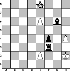 game notation in PGN-format [Event "Clubmeisterschaft der Godzillas 2016"] [Site "www.myChess.de"] [Date "2016.02.15"] [Round "1"] [White "wolni55"] [Black "martinus"] [ECO "B20"] [WhitemyELO "1482"] [BlackmyELO "1783"] [Result "0-1"] [TimeControl "10/2592000"] [WhiteDays "226"] [BlackDays "208"] [MyChessNo "102528"] 1. e4 c5 2. Bc4 e6 3. Nf3 Nc6 4. d3 g6 5. Be3 b6 6. c3 Nf6 7. h3 Bg7 8. a4 O-O 9. Bg5 Qc7 10. Na3 a6 11. Qd2 d5 12. Bf4 Qe7 13. e5 Nd7 14. Ba2 Ndxe5 15. Qe3 Nxf3+ 16. Qxf3 Bb7 17. O-O e5 18. Rfe1 Qf6 19. Bg3 Qxf3 20. gxf3 Rad8 21. Rad1 f5 22. f4 e4 23. dxe4 Ne7 24. Bh4 Bf6 25. Bg5 c4 26. e5 Bxg5 27. fxg5 Kg7 28. f4 h6 29. gxh6+ Kxh6 30. Kf2 Rh8 31. h4 Kg7 32. Kg3 Rh5 33. Nc2 Rdh8 34. Rh1 d4 35. Rh2 d3 36. Ne3 b5 37. axb5 axb5 38. b3 Nd5 39. Nxd5 Bxd5 40. bxc4 bxc4 41. Bb1 Ra8 42. Bxd3 cxd3 43. Rxd3 Be4 44. Rd7+ Kg8 45. Rhd2 Kf8 46. Rd8+ Rxd8 47. Rxd8+ Ke7 48. Rd6 Rh6 49. c4 Bb7 50. c5 Bc8 51. c6 Be6 52. c7 Rh8 53. Rb6 Rc8 54. Rb8 Rxc7 55. Rh8 Rc3+ 56. Kf2 Bd5 57. Rh6 Kf7 58. Rh7+ Kg8 59. Rd7 Rf3+ 60. Kg1 Be4 61. e6 Kf8 62. Rf7+ Ke8 63. Rg7 Rg3+ 64. Kh2 Rg2+ 65. Kh3 Rg4 66. Rd7 Rxf4 67. Rg7 Rf3+ 68. Kh2 f4 69. Rxg6 Bxg6 0-1 position notation in FEN-format 4k3/8/4P1b1/8/5p1P/5r2/4P2K/8 - - - 0 70 Captured white pieces: Captured black pieces: Click on a captured piece in order to display the desired move!