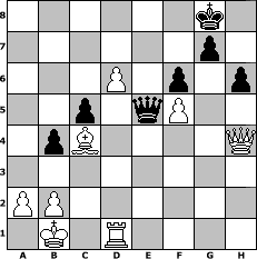 game notation in PGN-format [Event "Cafehausturnier f"] [Site "www.myChess.de"] [Date "2009.05.12"] [Round "1"] [White "mkauf"] [Black "rux"] [ECO "A57"] [WhitemyELO "1488"] [BlackmyELO "1452"] [Result "1-0"] [TimeControl "10/864000"] [WhiteDays "09"] [BlackDays "10"] [MyChessNo "55637"] 1. d4 Nf6 2. c4 c5 3. d5 b5 4. cxb5 a6 5. Nc3 axb5 6. e4 b4 7. Nb5 d6 8. Bc4 Nxe4 9. Qe2 Nf6 10. Bf4 e5 11. Bg5 Be7 12. Bxf6 Bxf6 13. f4 O-O 14. Nf3 e4 15. Nd2 Re8 16. O-O-O e3 17. Nf3 Bf5 18. h3 Qe7 19. g4 Qe4 20. gxf5 Rc8 21. Nxd6 Qxf4 22. Nxc8 Nd7 23. Nd6 Qxd6 24. Qxe3 h6 25. Kb1 Ne5 26. Nxe5 Re8 27. Rhe1 Bg5 28. Qg3 f6 29. h4 Bxh4 30. Qxh4 Rxe5 31. Rxe5 Qxe5 32. d6+ 1-0 position notation in FEN-format 6k1/6p1/3P1p1p/2p1qP2/1pB4Q/8/PP6/1K1R4 - - - 0 32 Captured white pieces: Captured black pieces: Click on a captured piece in order to display the desired move!