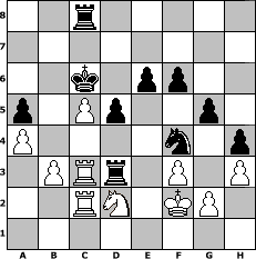 game notation in PGN-format [Event "1.No-Engine-Schachturnier."] [Site "www.myChess.de"] [Date "2013.06.04"] [Round "1"] [White "Achimkogge"] [Black "DianaHelmund"] [ECO "A46"] [WhitemyELO "1411"] [BlackmyELO "1493"] [Result "1/2-1/2"] [TimeControl "10/1728000"] [WhiteDays "20"] [BlackDays "12"] [MyChessNo "88599"] 1. d4 Nf6 2. Nf3 c5 3. c3 d5 4. Ne5 e6 5. e3 Nc6 6. Bb5 Qb6 7. Qa4 Qc7 8. Nxc6 bxc6 9. Bxc6+ Bd7 10. Bxd7+ Qxd7 11. Qxd7+ Kxd7 12. f3 Rb8 13. b3 a5 14. Ba3 cxd4 15. exd4 h5 16. Bxf8 Rhxf8 17. Nd2 Ng8 18. O-O Ne7 19. Rfe1 Rfc8 20. Rac1 g5 21. h3 h4 22. a4 f6 23. Kf2 Ng6 24. Re3 Rb7 25. c4 Nf4 26. c5 Rb4 27. Rc2 Rxd4 28. Rec3 Kc6 29. Nb1 Rd3 30. Nd2 1/2-1/2 position notation in FEN-format 2r5/8/2k1pp2/p1Pp2p1/P4n1p/1PRr1P1P/2RN1KP1/8 - - - 5 30 Captured white pieces: Captured black pieces: Click on a captured piece in order to display the desired move!