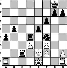 game notation in PGN-format [Event " Fluegel Gambit"] [Site "www.myChess.de"] [Date "2005.12.13"] [Round "1"] [White "Knight"] [Black "nogumo"] [ECO "B20"] [WhitemyELO "1433"] [BlackmyELO "1893"] [Result "0-1"] [TimeControl "10/2592000"] [WhiteDays "85"] [BlackDays "88"] [MyChessNo "20669"] 1. e4 c5 2. b4 cxb4 3. a3 d5 4. exd5 Qxd5 5. Bb2 e5 6. axb4 Bxb4 7. Qe2 Nc6 8. Nf3 Bg4 9. Nc3 Bxc3 10. Bxc3 f6 11. Qd3 Bxf3 12. gxf3 Nge7 13. Bg2 Qxd3 14. cxd3 Rd8 15. Bf1 O-O 16. O-O-O Nd5 17. Bb2 Nf4 18. d4 Nxd4 19. Bxd4 Rxd4 20. d3 Rc8+ 21. Kd2 a5 22. Ke1 b5 23. Be2 a4 24. Ra1 Rc2 0-1 position notation in FEN-format 6k1/6pp/5p2/1p2p3/p2r1n2/3P1P2/2r1BP1P/R3K2R - - - 2 25 Captured white pieces: Captured black pieces: Click on a captured piece in order to display the desired move!