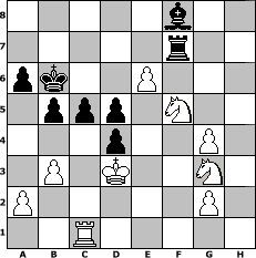 game notation in PGN-format [Event "Windecker Herbst-Open"] [Site "www.myChess.de"] [Date "2014.10.08"] [Round "1"] [White "UPS"] [Black "reisinger"] [ECO "C41"] [WhitemyELO "1650"] [BlackmyELO "1457"] [Result "1-0"] [TimeControl "10/1728000"] [WhiteDays "20"] [BlackDays "20"] [MyChessNo "96187"] 1. e4 e5 2. Nf3 d6 3. Nc3 Nc6 4. h3 f5 5. d3 Nf6 6. Bg5 h6 7. Bxf6 gxf6 8. exf5 Bxf5 9. Nh4 Bh7 10. Qh5+ Kd7 11. Be2 Kc8 12. Bg4+ Kb8 13. O-O Nd4 14. Rac1 a6 15. Ne4 Rg8 16. c3 d5 17. Qf7 Rg7 18. Qxf6 Qxf6 19. Nxf6 Bxd3 20. cxd4 Bxf1 21. Kxf1 exd4 22. Nf5 Rf7 23. Nh5 c5 24. b3 Ka7 25. Ke2 Re8+ 26. Kd3 b5 27. Nhg3 Re5 28. f4 h5 29. fxe5 hxg4 30. hxg4 Kb6 31. e6 1-0 position notation in FEN-format 5b2/5r2/pk2P3/1ppp1N2/3p2P1/1P1K2N1/P5P1/2R5 - - - 0 31 Captured white pieces: Captured black pieces: Click on a captured piece in order to display the desired move!