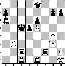 game notation in PGN-format [Event "Sommerpause"] [Site "www.myChess.de"] [Date "2011.06.29"] [Round "2"] [White "Naunhofer"] [Black "Duschgel"] [ECO "B12"] [WhitemyELO "1611"] [BlackmyELO "1586"] [Result "0-1"] [TimeControl "10/864000"] [WhiteDays "10"] [BlackDays "10"] [MyChessNo "74778"] 1. e4 c6 2. d4 d5 3. e5 c5 4. Bb5+ Nc6 5. Bxc6+ bxc6 6. Ne2 e6 7. O-O Qb6 8. b3 cxd4 9. Nxd4 c5 10. Ne2 Ba6 11. Kh1 Ne7 12. f4 Nf5 13. Re1 c4 14. g4 Nh4 15. Nd4 Bc5 16. Be3 Rc8 17. Nc3 Qb4 18. Na4 Bxd4 19. Bxd4 cxb3 20. axb3 Nf3 21. Qxf3 Qxd4 22. Rad1 Qb4 23. f5 Rxc2 24. fxe6 fxe6 25. Rc1 Rf8 26. Qg3 Rff2 27. Nc5 Qxc5 0-1 position notation in FEN-format 4k3/p5pp/b3p3/2qpP3/6P1/1P4Q1/2r2r1P/2R1R2K - - - 0 28 Captured white pieces: Captured black pieces: Click on a captured piece in order to display the desired move!