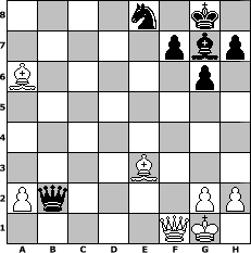 game notation in PGN-format [Event "Unser WM-Turnier"] [Site "www.myChess.de"] [Date "2018.07.07"] [Round "1"] [White "Rotstift10"] [Black "Joschi"] [ECO "A56"] [WhitemyELO "1625"] [BlackmyELO "1542"] [Result "1/2-1/2"] [TimeControl "10/3456000"] [WhiteDays "36"] [BlackDays "40"] [MyChessNo "112539"] 1. d4 Nf6 2. c4 c5 3. Nf3 g6 4. Bf4 Bg7 5. Nc3 cxd4 6. Nxd4 d6 7. Bg5 O-O 8. e4 Nc6 9. f3 a6 10. Nxc6 bxc6 11. Rb1 Bb7 12. Be2 Qb6 13. Qd2 Rfd8 14. Be3 Qc7 15. O-O Rd7 16. Rfd1 Rad8 17. Qe1 e5 18. Qh4 Ne8 19. f4 d5 20. exd5 cxd5 21. cxd5 Bxd5 22. Nxd5 Rxd5 23. Rxd5 Rxd5 24. Bxa6 exf4 25. Qxf4 Qc2 26. Rf1 Rf5 27. Qc4 Rxf1+ 28. Qxf1 Qxb2 1/2-1/2 position notation in FEN-format 4n1k1/5pbp/B5p1/8/8/4B3/Pq4PP/5QK1 - - - 0 29 Captured white pieces: Captured black pieces: Click on a captured piece in order to display the desired move!