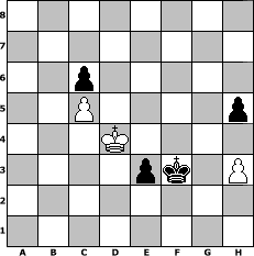 game notation in PGN-format [Event "Nimzo-Indisch"] [Site "www.myChess.de"] [Date "2011.10.17"] [Round "2"] [White "Zwilling"] [Black "Joschi"] [ECO "E20"] [WhitemyELO "1539"] [BlackmyELO "1583"] [Result "0-1"] [TimeControl "10/2592000"] [WhiteDays "143"] [BlackDays "116"] [MyChessNo "76949"] 1. d4 Nf6 2. c4 e6 3. Nc3 Bb4 4. Bd2 d5 5. c5 O-O 6. a3 Bxc3 7. Bxc3 b6 8. Nf3 a5 9. e3 c6 10. b4 axb4 11. axb4 Rxa1 12. Qxa1 bxc5 13. bxc5 Qc7 14. Ne5 Nbd7 15. Ba5 Qa7 16. Nxd7 Bxd7 17. Bc3 Qxa1+ 18. Bxa1 Ra8 19. Bc3 Ne4 20. Bb4 Ra4 21. f3 Rxb4 22. fxe4 dxe4 23. Be2 Rb1+ 24. Bd1 e5 25. dxe5 Bg4 26. Kd2 Kf8 27. Kc2 Rxd1 28. Rxd1 Bxd1+ 29. Kxd1 Ke7 30. Kd2 Ke6 31. Kc3 Kxe5 32. Kc4 f5 33. g3 g5 34. h3 h5 35. Kb4 f4 36. gxf4+ gxf4 37. exf4+ Kxf4 38. Kc3 Kf3 39. Kd4 e3 0-1 position notation in FEN-format 8/8/2p5/2P4p/3K4/4pk1P/8/8 - - - 0 40 Captured white pieces: Captured black pieces: Click on a captured piece in order to display the desired move!