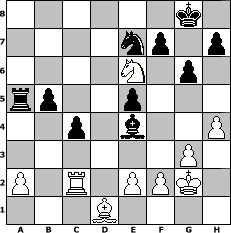 | game notation in PGN-format [Event "Mail"] [Site "www.myChess.de"] [Date "2012.05.01"] [Round "1"] [White "Haki"] [Black "Seneca"] [ECO "C00"] [WhitemyELO "1334"] [BlackmyELO "1353"] [Result "0-1"] [TimeControl "10/864000"] [WhiteDays "10"] [BlackDays "08"] [MyChessNo "81424"] 1. e4 e6 2. d3 g6 3. Nf3 Bg7 4. g3 Ne7 5. Bg2 O-O 6. O-O Nbc6 7. c3 a6 8. Nbd2 d5 9. Re1 dxe4 10. dxe4 Ne5 11. Nxe5 Bxe5 12. Nf3 Bg7 13. Bf4 c6 14. Qxd8 Rxd8 15. Rad1 Re8 16. b4 Bxc3 17. Bd2 Bxd2 18. Rxd2 b5 19. h4 a5 20. bxa5 Rxa5 21. Red1 c5 22. Rc2 c4 23. Nd4 Rd8 24. Bf3 Bb7 25. Kg2 e5 26. Ne6 Rxd1 27. Bxd1 Bxe4+ 0-1 position notation in FEN-format 6k1/4np1p/4N1p1/rp2p3/2p1b2P/6P1/P1R1PPK1/3B4 - - - 0 28 Captured white pieces:                              Captured black pieces:                               Click on a captured piece in order to display the desired move!