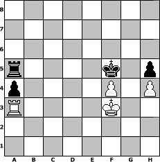 game notation in PGN-format [Event "Ostern 2011"] [Site "www.myChess.de"] [Date "2011.03.18"] [Round "2"] [White "Gauss1233"] [Black "lotchi"] [ECO "D10"] [WhitemyELO "1419"] [BlackmyELO "1413"] [Result "1/2-1/2"] [TimeControl "10/2592000"] [WhiteDays "164"] [BlackDays "179"] [MyChessNo "72882"] 1. d4 d5 2. c4 c6 3. e3 Nf6 4. cxd5 Nxd5 5. Nc3 Nxc3 6. bxc3 e6 7. c4 Bb4+ 8. Bd2 Bxd2+ 9. Qxd2 O-O 10. Nf3 f6 11. Be2 a6 12. O-O Nd7 13. e4 a5 14. a4 b6 15. d5 cxd5 16. exd5 e5 17. Rfd1 e4 18. Ne1 Nc5 19. Qe3 f5 20. g3 Bd7 21. Ng2 Bxa4 22. Rdb1 Rb8 23. Nf4 Bc2 24. Rc1 Bd3 25. Nxd3 exd3 26. Bxd3 Nb3 27. Qe6+ Kh8 28. Bxf5 Nxa1 29. Rxa1 g6 30. Qe5+ Qf6 31. Qxf6+ Rxf6 32. Be4 Re8 33. f3 g5 34. Rd1 Rd6 35. h3 h6 36. Kf2 a4 37. Rd3 Ra8 38. Ra3 Kg7 39. Ke3 Kf6 40. f4 gxf4+ 41. gxf4 Kf7 42. Kd4 Kf6 43. h4 Kf7 44. c5 bxc5+ 45. Kxc5 Ke7 46. Kb5 Rda6 47. d6+ Kxd6 48. Bxa8 Rxa8 49. Kc4 Ke6 50. Kd4 Kf5 51. Ke3 h5 52. Kf3 Ra5 1/2-1/2 position notation in FEN-format 8/8/8/r4k1p/p4P1P/R4K2/8/8 - - - 2 53 Captured white pieces: Captured black pieces: Click on a captured piece in order to display the desired move!