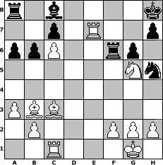 game notation in PGN-format [Event "Oktoberrevolution"] [Site "www.myChess.de"] [Date "2004.09.26"] [Round "1"] [White "Pryrates"] [Black "Knight"] [ECO "E21"] [WhitemyELO "1500"] [BlackmyELO "1374"] [Result "1-0"] [TimeControl "10/864000"] [WhiteDays "06"] [BlackDays "09"] [MyChessNo "7051"] 1. d4 Nf6 2. c4 e6 3. Nc3 Bb4 4. Nf3 d5 5. cxd5 Nxd5 6. Bd2 Nc6 7. e4 Nb6 8. Bb5 Bd7 9. O-O O-O 10. a3 Bxc3 11. Bxc3 a6 12. Bd3 Bc8 13. e5 Nd7 14. Bc2 Nb6 15. Qd3 g6 16. Rac1 f5 17. exf6 Nd5 18. Rfe1 Rxf6 19. Ng5 Nf4 20. Qe4 Qf8 21. d5 e5 22. dxc6 b6 23. Bb3+ Kh8 24. Qxe5 Nh5 25. Qe7 Qxe7 26. Rxe7 1-0 position notation in FEN-format r1b4k/2p1R2p/ppP2rp1/6Nn/8/PBB5/1P3PPP/2R3K1 - - - 0 26 Captured white pieces: Captured black pieces: Click on a captured piece in order to display the desired move!