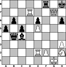 game notation in PGN-format [Event "f"] [Site "www.myChess.de"] [Date "2005.12.25"] [Round "1"] [White "MichaelKnopf"] [Black "Whiskey40"] [ECO "A00"] [WhitemyELO "1499"] [BlackmyELO "1522"] [Result "1-0"] [TimeControl "10/864000"] [WhiteDays "10"] [BlackDays "10"] [MyChessNo "21177"] 1. g3 e6 2. Bg2 d5 3. Nf3 Nh6 4. O-O Bc5 5. c3 O-O 6. d4 Bd6 7. Bxh6 gxh6 8. Nbd2 Nc6 9. e4 Re8 10. e5 Bf8 11. Qe2 Bg7 12. h3 b6 13. Nh2 a5 14. a3 Ba6 15. c4 Nxd4 16. Qg4 c5 17. b3 Nc2 18. Ra2 Nd4 19. Raa1 Rb8 20. Ra2 Kh8 21. Re1 dxc4 22. bxc4 Qd7 23. Bf1 Qa4 24. Bd3 Rbd8 25. Qe4 f5 26. Qg2 Nb3 27. Qf3 Nxd2 28. Rxd2 Qxa3 29. g4 Qb4 30. Ree2 Rb8 31. gxf5 Rf8 32. f6 Bxc4 33. fxg7+ Kg8 34. gxf8=Q+ Rxf8 35. Bxh7+ Kxh7 36. Rd7+ Kg8 37. Qg3+ Kh8 38. Qg7# 1-0 position notation in FEN-format 5r1k/3R2Q1/1p2p2p/p1p1P3/1qb5/7P/4RP1N/6K1 - - - 5 38 Captured white pieces: Captured black pieces: Click on a captured piece in order to display the desired move!