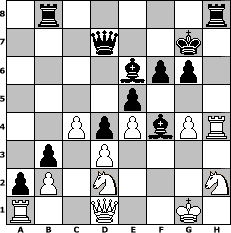 game notation in PGN-format [Event "F"] [Site "www.myChess.de"] [Date "2017.08.16"] [Round "1"] [White "muetoe"] [Black "jeremyt"] [ECO "C68"] [WhitemyELO "1919"] [BlackmyELO "2142"] [Result "0-1"] [TimeControl "10/2592000"] [WhiteDays "124"] [BlackDays "122"] [MyChessNo "109209"] 1. e4 e5 2. Nf3 Nc6 3. Bb5 a6 4. Bxc6 dxc6 5. h3 c5 6. d3 Bd6 7. Bg5 f6 8. Be3 Ne7 9. a4 Nc6 10. a5 O-O 11. Nbd2 Be6 12. Nh2 b5 13. axb6 cxb6 14. Ndf3 a5 15. Nf1 b5 16. h4 a4 17. h5 b4 18. h6 g6 19. N3d2 b3 20. c3 Nd4 21. Bxd4 cxd4 22. c4 a3 23. Rb1 a2 24. Ra1 Qa5 25. f3 Rfb8 26. Ke2 Qb6 27. Nh2 Ba3 28. Qc1 Ra6 29. Rf1 Bf8 30. Rg1 Bxh6 31. Rh1 Bg5 32. g4 Qb4 33. Nhf1 Rc6 34. Qd1 h6 35. Rg1 Rcc8 36. Rh1 Bf4 37. Rc1 Kf7 38. Ra1 h5 39. Kf2 hxg4 40. fxg4 Kg7 41. Rh4 Qb7 42. Kg1 Qd7 43. Nh2 Rh8 0-1 position notation in FEN-format 1r5r/3q2k1/4bpp1/4p3/2PpPbPR/1p1P4/pP1N3N/R2Q2K1 - - - 7 44 Captured white pieces: Captured black pieces: Click on a captured piece in order to display the desired move!