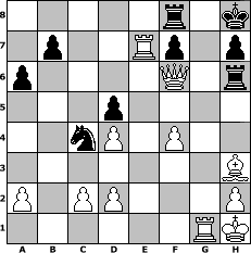 game notation in PGN-format [Event "Die Weinlese 2017"] [Site "www.myChess.de"] [Date "2017.09.05"] [Round "1"] [White "espero"] [Black "Grubengeist"] [ECO "D00"] [WhitemyELO "1964"] [BlackmyELO "2009"] [Result "1/2-1/2"] [TimeControl "10/1728000"] [WhiteDays "40"] [BlackDays "56"] [MyChessNo "109440"] 1. d4 d5 2. Bf4 Nf6 3. e3 c5 4. Nc3 cxd4 5. exd4 a6 6. Nf3 Nc6 7. Ne5 Bd7 8. Nxd7 Qxd7 9. g3 e6 10. Bg2 Bb4 11. O-O Bxc3 12. bxc3 Na5 13. Re1 Rc8 14. Be5 O-O 15. Bxf6 gxf6 16. f4 f5 17. g4 Rxc3 18. gxf5 exf5 19. Qh5 Rc6 20. Bh3 Rf6 21. Re5 Qc6 22. Kh1 Rh6 23. Qxf5 Nc4 24. Rg1+ Kh8 25. Re7 Qf6 26. Qxf6+ 1/2-1/2 position notation in FEN-format 5r1k/1p2Rp1p/p4Q1r/3p4/2nP1P2/7B/P1PP3P/6RK - - - 0 26 Captured white pieces: Captured black pieces: Click on a captured piece in order to display the desired move!