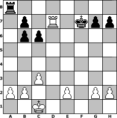 game notation in PGN-format [Event "4. Norderstedter DENK MAL Open 2013"] [Site "www.myChess.de"] [Date "2013.01.09"] [Round "1"] [White "martinus"] [Black "Teresa"] [ECO "C21"] [WhitemyELO "1702"] [BlackmyELO "1509"] [Result "1-0"] [TimeControl "10/2592000"] [WhiteDays "30"] [BlackDays "30"] [MyChessNo "86079"] 1. e4 e5 2. d4 exd4 3. c3 d5 4. Qxd4 Nf6 5. e5 Ne4 6. Be3 Bc5 7. Qd3 Nc6 8. Nf3 Bb6 9. Nbd2 Bf5 10. Bxb6 axb6 11. Qe3 Nxd2 12. Qxd2 O-O 13. Bd3 Bxd3 14. Qxd3 Nxe5 15. Nxe5 Qe7 16. f4 f6 17. Qxd5+ Rf7 18. O-O-O fxe5 19. fxe5 c6 20. Qb3 Qxe5 21. Rhf1 Qc7 22. Rxf7 Qxf7 23. Qxf7+ Kxf7 24. Rd7+ 1-0 position notation in FEN-format r7/1p1R1kpp/1pp5/8/8/2P5/PP2P1PP/2K5 - - - 1 24 Captured white pieces: Captured black pieces: Click on a captured piece in order to display the desired move!