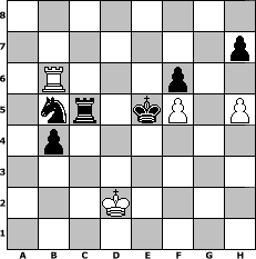 game notation in PGN-format [Event "Sp"] [Site "www.myChess.de"] [Date "2011.09.07"] [Round "1"] [White "faustballer"] [Black "Seneca"] [ECO "A41"] [WhitemyELO "1510"] [BlackmyELO "1516"] [Result "0-1"] [TimeControl "10/1728000"] [WhiteDays "20"] [BlackDays "13"] [MyChessNo "76173"] 1. d4 d6 2. e4 Nf6 3. Nc3 g6 4. Bc4 Bg7 5. h3 O-O 6. Nf3 a6 7. Bg5 Qe8 8. Qd3 e6 9. O-O-O Nfd7 10. g4 b5 11. Bb3 c5 12. Qe2 c4 13. Bxc4 bxc4 14. Qxc4 Nb6 15. Qc7 N8d7 16. Qxd6 f6 17. Bd2 Bb7 18. Rhe1 Nc4 19. Qb4 Nxd2 20. Rxd2 Rb8 21. Qa5 Qd8 22. Qxd8 Rfxd8 23. a3 Rdc8 24. Rd3 Nb6 25. Nd2 Bh6 26. Kb1 Bxd2 27. Rxd2 Kf7 28. f4 Nc4 29. Rf2 Bc6 30. d5 Rxb2+ 31. Kc1 exd5 32. exd5 Bd7 33. Re4 Rb6 34. Rfe2 Bb5 35. Re7+ Kg8 36. Nxb5 axb5 37. h4 Nxa3 38. R7e6 Rxe6 39. Rxe6 Rxc2+ 40. Kd1 Kf7 41. Ra6 Rc3 42. d6 Ke6 43. Kd2 b4 44. f5+ gxf5 45. gxf5+ Kd7 46. h5 Nb5 47. Rb6 Rc5 48. Rb7+ Kxd6 49. Rb6+ Ke5 0-1 position notation in FEN-format 8/7p/1R3p2/1nr1kP1P/1p6/8/3K4/8 - - - 2 50 Captured white pieces: Captured black pieces: Click on a captured piece in order to display the desired move!