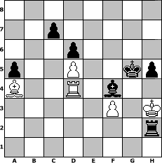 game notation in PGN-format [Event "XII. Klub-Meisterschaft -Die Wikinger-"] [Site "www.myChess.de"] [Date "2016.05.01"] [Round "2"] [White "borsti"] [Black "Grubengeist"] [ECO "B07"] [WhitemyELO "1235"] [BlackmyELO "1989"] [Result "0-1"] [TimeControl "10/2592000"] [WhiteDays "30"] [BlackDays "28"] [MyChessNo "103517"] 1. e4 d6 2. d4 Nf6 3. Nc3 g6 4. Bg5 Bg7 5. Nf3 h6 6. Bxf6 Bxf6 7. Bd3 Nc6 8. O-O O-O 9. Qe2 e5 10. d5 Ne7 11. Rad1 a6 12. Bc4 Bg7 13. a4 Kh7 14. h3 f5 15. Rfe1 Ng8 16. b4 Nf6 17. a5 b5 18. Bb3 Nh5 19. g3 fxe4 20. Qxe4 Bxh3 21. g4 Rf4 22. gxh5 Rxe4 23. hxg6+ Kxg6 24. Rxe4 Qf6 25. Rd3 Bf5 26. Kf1 Bxe4 27. Nxe4 Qf4 28. Ned2 e4 29. Nxe4 Qe5 30. Nxe5+ Bxe5 31. Rf3 Rh8 32. Kg2 Re8 33. Nd2 h5 34. c4 Rb8 35. Ne4 bxc4 36. Bxc4 Rxb4 37. Nd2 Ra4 38. Rf8 Bc3 39. Rf4 Kg5 40. Re4 Bxd2 41. Kf3 Rxa5 42. Kg2 Ra4 43. Kh3 Bf4 44. f3 a5 45. Rd4 Ra1 46. Bb5 Ra2 47. Ba4 Rh2# 0-1 position notation in FEN-format 8/2p5/3p4/p2P2kp/B2R1b2/5P1K/7r/8 - - - 6 48 Captured white pieces: Captured black pieces: Click on a captured piece in order to display the desired move!