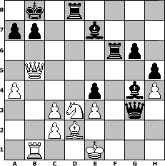 game notation in PGN-format [Event "Winter 19/20"] [Site "www.myChess.de"] [Date "2020.01.09"] [Round "1"] [White "lotchi"] [Black "HPB2005"] [ECO "A46"] [WhitemyELO "1308"] [BlackmyELO "1901"] [Result "0-1"] [TimeControl "10/2592000"] [WhiteDays "118"] [BlackDays "099"] [MyChessNo "116892"] 1. d4 Nf6 2. Nf3 c5 3. Nc3 d5 4. Bg5 Ne4 5. Be3 Nxc3 6. bxc3 g6 7. dxc5 e6 8. Bg5 f6 9. Be3 Na6 10. h3 Qc7 11. c6 Qxc6 12. Bd2 Nc5 13. Nd4 Qc7 14. g3 e5 15. Nb3 Ne4 16. Bg2 Be6 17. Bxe4 dxe4 18. e3 O-O-O 19. f4 Kb8 20. a4 Be7 21. Qe2 Bc4 22. Qf2 h5 23. fxe5 fxe5 24. h4 Rhf8 25. Qg2 Rf6 26. Qxe4 Bd5 27. Qd3 Bxh1 28. Qe2 Bf3 29. Qb5 Bg4 30. Nc1 Qd6 31. Nd3 e4 32. Rb1 Qxg3+ 0-1 position notation in FEN-format 1k1r4/pp2b3/5rp1/1Q5p/P3p1bP/2PNP1q1/2PB4/1R2K3 - - - 0 33 Captured white pieces: Captured black pieces: Click on a captured piece in order to display the desired move!