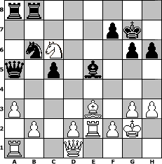 game notation in PGN-format [Event "Come Back"] [Site "www.myChess.de"] [Date "2015.09.04"] [Round "1"] [White "pepo47"] [Black "Joschi"] [ECO "A58"] [WhitemyELO "2078"] [BlackmyELO "1595"] [Result "1-0"] [TimeControl "10/2592000"] [WhiteDays "90"] [BlackDays "90"] [MyChessNo "100307"] 1. d4 Nf6 2. c4 c5 3. d5 b5 4. cxb5 a6 5. bxa6 Bxa6 6. Nc3 d6 7. Nf3 Nbd7 8. e4 Bxf1 9. Kxf1 g6 10. g3 Bg7 11. Kg2 O-O 12. h3 Qb6 13. Re1 Rfb8 14. Re2 Qb4 15. Bg5 h6 16. Be3 Nb6 17. e5 dxe5 18. a3 Qa5 19. Nxe5 Nfxd5 20. Nxd5 Bxe5 21. Nxe7+ Kg7 22. Nc6 1-0 position notation in FEN-format rr6/5pk1/1nN3pp/q1p1b3/8/P3B1PP/1P1PRPK1/R2Q4 - - - 2 22 Captured white pieces: Captured black pieces: Click on a captured piece in order to display the desired move!