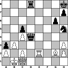game notation in PGN-format [Event "zum Dritten"] [Site "www.myChess.de"] [Date "2012.12.05"] [Round "1"] [White "Wernburger"] [Black "martinus"] [ECO "A16"] [WhitemyELO "1635"] [BlackmyELO "1702"] [Result "1/2-1/2"] [TimeControl "10/864000"] [WhiteDays "10"] [BlackDays "10"] [MyChessNo "85308"] 1. c4 Nf6 2. Nc3 g6 3. d4 d6 4. e4 Bg7 5. f3 O-O 6. Be3 Nc6 7. Qd2 Re8 8. O-O-O a5 9. Kb1 a4 10. Nb5 e5 11. d5 Nd4 12. Nxd4 exd4 13. Bxd4 a3 14. b3 c5 15. dxc6 bxc6 16. Qf4 Nh5 17. Qd2 Nf6 18. Ba1 Be6 19. Nh3 Bxh3 20. gxh3 Qe7 21. Bg2 Red8 22. Rhe1 c5 23. f4 Rab8 24. Qc1 Qa7 25. e5 dxe5 26. fxe5 Ne8 27. e6 fxe6 28. Rxd8 Rxd8 29. Rxe6 Bxa1 30. Bd5 Kh8 31. Kxa1 Qg7+ 32. Kb1 Qd4 33. Re2 Nf6 34. Bg2 Nh5 1/2-1/2 position notation in FEN-format 3r3k/7p/6p1/2p4n/2Pq4/pP5P/P1P1R1BP/1KQ5 - - - 7 35 Captured white pieces: ![]() ![]() ![]() ![]() ![]() ![]() ![]() ![]() ![]() ![]() ![]() ![]() ![]() ![]() ![]() Captured black pieces: ![]() ![]() ![]() ![]() ![]() ![]() ![]() ![]() ![]() ![]() ![]() ![]() ![]() ![]() ![]() Click on a captured piece in order to display the desired move!