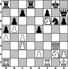 game notation in PGN-format [Event "Onyx"] [Site "www.myChess.de"] [Date "2022.07.05"] [Round "1"] [White "kalle"] [Black "MiFie"] [ECO "C50"] [WhitemyELO "1577"] [BlackmyELO "1054"] [Result "1-0"] [TimeControl "10/1728000"] [WhiteDays "14"] [BlackDays "20"] [MyChessNo "126372"] 1. e4 e5 2. Nf3 Nc6 3. Bc4 Qf6 4. c3 Bc5 5. O-O Nge7 6. b4 Bd6 7. d3 O-O 8. a4 h6 9. Kh1 a6 10. Be3 Ng6 11. Ng1 Nf4 12. Nd2 a5 13. b5 Ne7 14. g3 Ne6 15. Ndf3 b6 16. Nh4 g5 17. Ng2 Bb7 18. f4 exf4 19. gxf4 gxf4 20. Bxf4 Ng5 21. Qg4 Bc8 22. Nh3 Ng6 23. Bxg5 Qg7 24. Bf6 Qh7 25. e5 Bxe5 26. Bxe5 d6 27. Qg3 Be6 28. Nhf4 Bxc4 29. dxc4 dxe5 30. Nh5 Rfd8 31. Nf6+ 1-0 position notation in FEN-format r2r2k1/2p2p1q/1p3Nnp/pP2p3/P1P5/2P3Q1/4P1NP/R4R1K - - - 3 31 Captured white pieces: Captured black pieces: Click on a captured piece in order to display the desired move!
