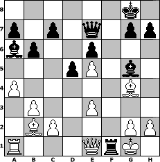 game notation in PGN-format [Event "Ostern 2011"] [Site "www.myChess.de"] [Date "2011.03.18"] [Round "2"] [White "Knight"] [Black "Helmut48"] [ECO "A01"] [WhitemyELO "1113"] [BlackmyELO "1872"] [Result "0-1"] [TimeControl "10/2592000"] [WhiteDays "55"] [BlackDays "49"] [MyChessNo "72872"] 1. b3 f5 2. Bb2 e6 3. e3 Nf6 4. Be2 Nc6 5. Nf3 b6 6. O-O Be7 7. Nc3 O-O 8. d4 d5 9. Ne5 Nxe5 10. dxe5 Ne4 11. Nxe4 fxe4 12. f4 exf3 13. Bxf3 Ba6 14. Rf2 Bg5 15. Qe1 Rc8 16. Bg4 Qe7 17. Rxf8+ Rxf8 18. a4 Rf1+ 0-1 position notation in FEN-format 6k1/p1p1q1pp/bp2p3/3pP1b1/P5B1/1P2P3/1BP3PP/R3QrK1 - - - 1 19 Captured white pieces: Captured black pieces: Click on a captured piece in order to display the desired move!