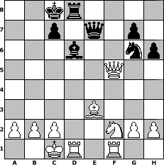 game notation in PGN-format [Event "Wanderpokal 2007"] [Site "www.myChess.de"] [Date "2007.06.23"] [Round "1"] [White "GIM1961"] [Black "MartinSilies"] [Variant "Fischerrandom"] [SetUp "1"] [FEN "rkbnnbqr/pppppppp/8/8/8/8/PPPPPPPP/RKBNNBQR w KQkq - 0 1"] [WhitemyELO "2024"] [BlackmyELO "1426"] [Result "1-0"] [TimeControl "10/864000"] [WhiteDays "29"] [BlackDays "07"] [MyChessNo "35950"] 1. e4 Nc6 2. f4 e5 3. fxe5 Nxe5 4. d4 Ng6 5. Nf3 Nf6 6. e5 Ne4 7. Bc4 Be7 8. Qe1 Nc5 9. dxc5 Bxc5 10. Ng5 d5 11. exd6 Bxd6 12. Nxf7 Qf8 13. Nxh8 Qxh8 14. Nf2 Bf5 15. Bg5 h6 16. Be3 a6 17. O-O-O O-O-O 18. Qe2 Qf8 19. Rhf1 Qe7 20. Bxa6 bxa6 21. Qxa6+ Kd7 22. Qb5+ Kc8 23. Qxf5+ 1-0 position notation in FEN-format 2kr4/2p1q1p1/3b2np/5Q2/8/4B3/PPP2NPP/2KR1R2 - - - 0 23 Captured white pieces: ![]() ![]() ![]() ![]() ![]() ![]() ![]() ![]() ![]() ![]() ![]() ![]() ![]() ![]() ![]() Captured black pieces: ![]() ![]() ![]() ![]() ![]() ![]() ![]() ![]() ![]() ![]() ![]() ![]() ![]() ![]() ![]() Click on a captured piece in order to display the desired move!