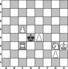 | game notation in PGN-format [Event "Wintergambit"] [Site "www.myChess.de"] [Date "2017.12.09"] [Round "1"] [White "faustballer"] [Black "borsti"] [ECO "D00"] [WhitemyELO "1477"] [BlackmyELO "1254"] [Result "1-0"] [TimeControl "10/2592000"] [WhiteDays "180"] [BlackDays "179"] [MyChessNo "110633"] 1. d4 d5 2. e4 dxe4 3. Nc3 Nf6 4. Be3 Bf5 5. Nge2 Nc6 6. h3 e5 7. dxe5 Nxe5 8. Ng3 Bg6 9. a3 Nc4 10. Bxc4 Bd6 11. Qd4 Qe7 12. Qd2 O-O-O 13. Qe2 Bc5 14. O-O Bxe3 15. Qxe3 Rhe8 16. Rfe1 c6 17. Qxa7 Qc7 18. Qe3 Rd7 19. Bb3 Rde7 20. Rad1 b5 21. Na2 c5 22. c3 Qc6 23. Rd2 c4 24. Nb4 Qb7 25. Bc2 h6 26. Ne2 Rd7 27. Rxd7 Qxd7 28. Qc5+ Qc7 29. Qxc7+ Kxc7 30. Nd4 Kb6 31. Ne2 Kc5 32. Ng3 Nd5 33. Nxd5 Kxd5 34. f3 e3 35. Be4+ Bxe4 36. fxe4+ Ke5 37. Rxe3 Rd8 38. Re2 Rd3 39. Kh2 f6 40. Rf2 g6 41. h4 g5 42. Rf5+ Ke6 43. hxg5 fxg5 44. Rxb5 Rd2 45. Rb6+ Ke5 46. Rxh6 Rxb2 47. Rc6 Rb3 48. Rxc4 Rxa3 49. Rc8 g4 50. c4 Kd6 51. Rg8 Ra4 52. Rxg4 Ke5 53. c5 Rc4 54. Rg5+ Kf4 55. Kh3 Rc3 56. Rf5+ Ke3 57. Rf3+ Kd4 58. Rxc3 1-0 position notation in FEN-format 8/8/8/2P5/3kP3/2R3NK/6P1/8 - - - 0 58 Captured white pieces:                              Captured black pieces:                               Click on a captured piece in order to display the desired move!